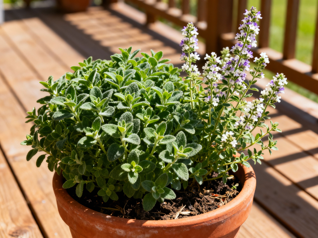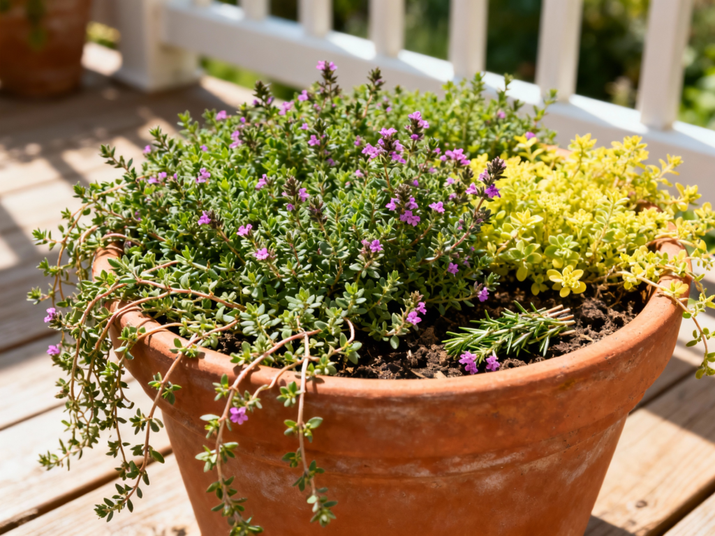 Thyme thrives on neglect. It stays compact, handles drought, and brings a woodsy, lemony note to meats and veggies. Plus it looks cute spilling over pot edges.