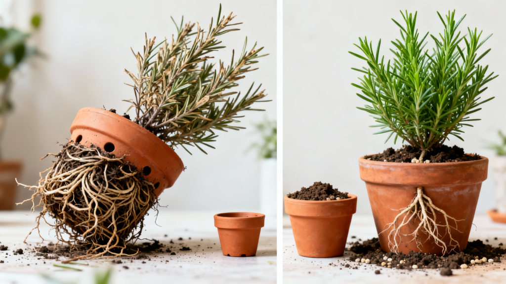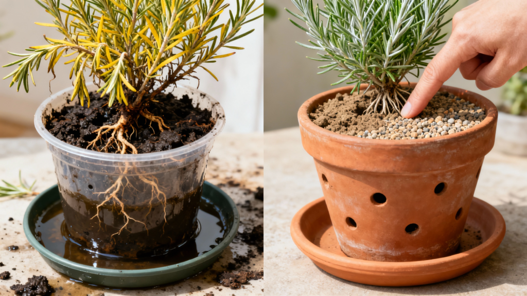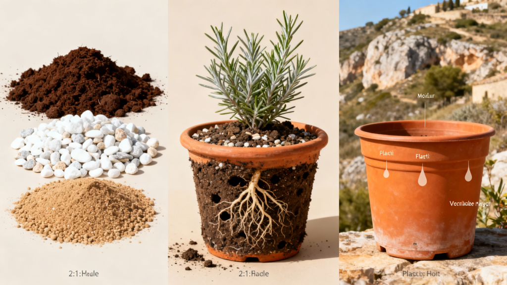 Rosemary comes from rocky Mediterranean hillsides, not swampy backyards. It wants gritty, fast-draining soil. Best mix for pots: 2 parts high-quality potting mix + 1 part perlite or pumice + a handful of coarse sand. That keeps roots happy and air moving.
