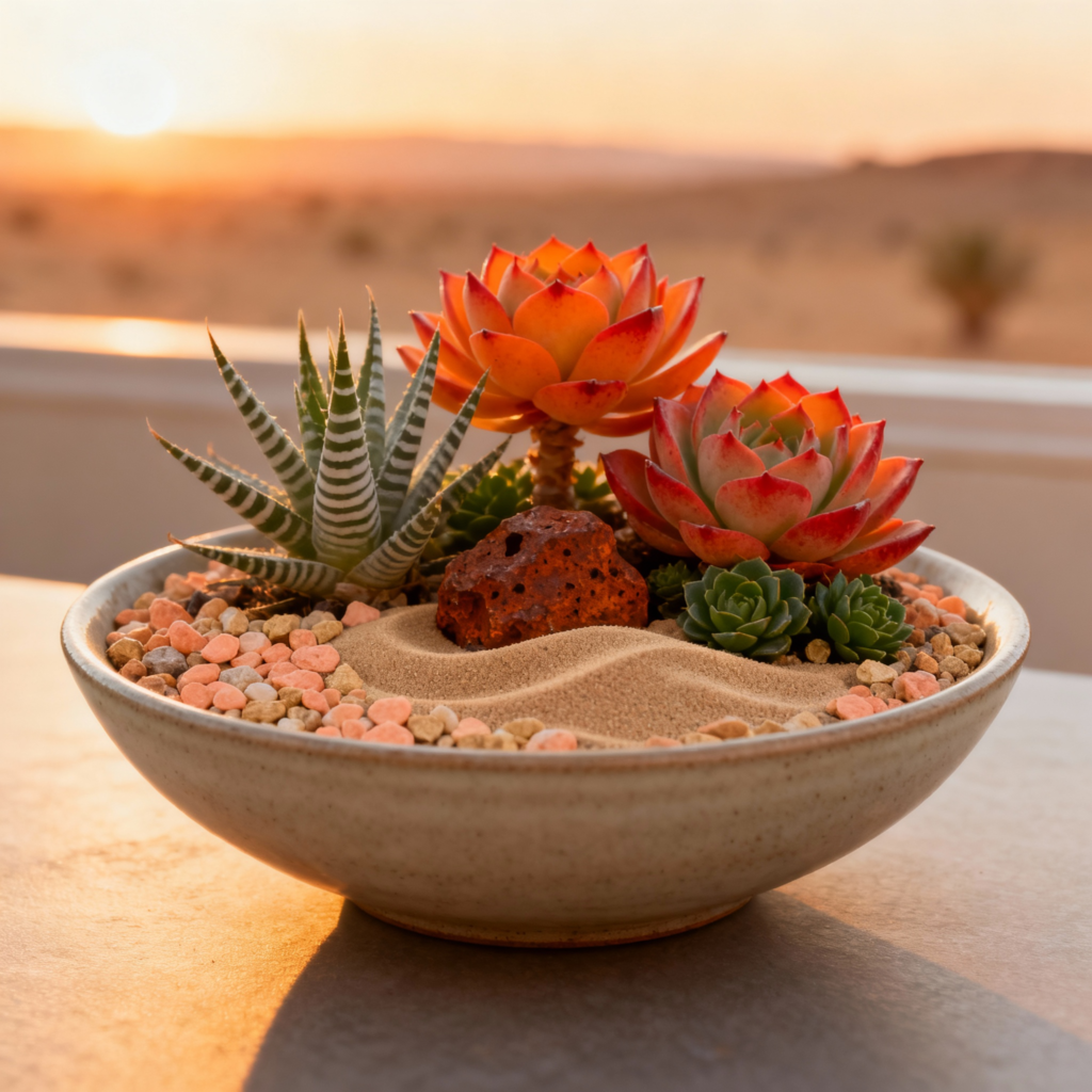 Play with warm tones—think oranges, reds, and deep greens. Use Echeveria, Haworthia, and a small rust-colored rock. Top with peach or tan gravel for the “sand dune at golden hour” vibe.