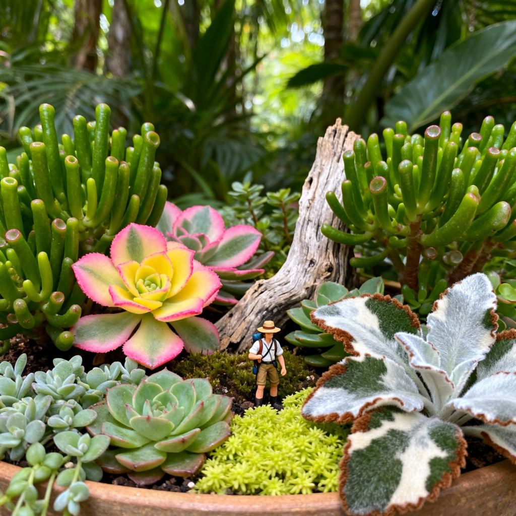 Mix textural succulents that feel lush: Crassula ovata ‘Hobbit’, Aeonium ‘Kiwi’, and Kalanchoe tomentosa. Add a mini figurine or driftwood for that explorer-core energy.