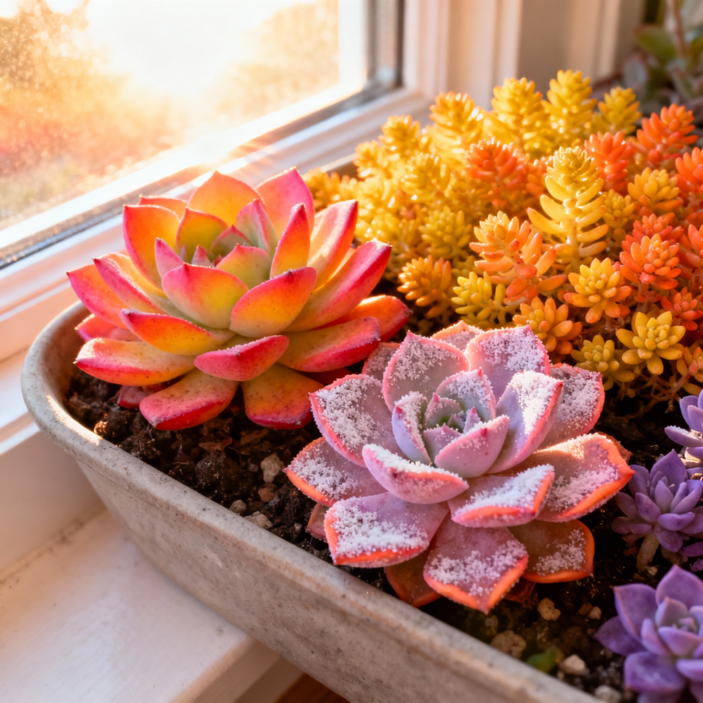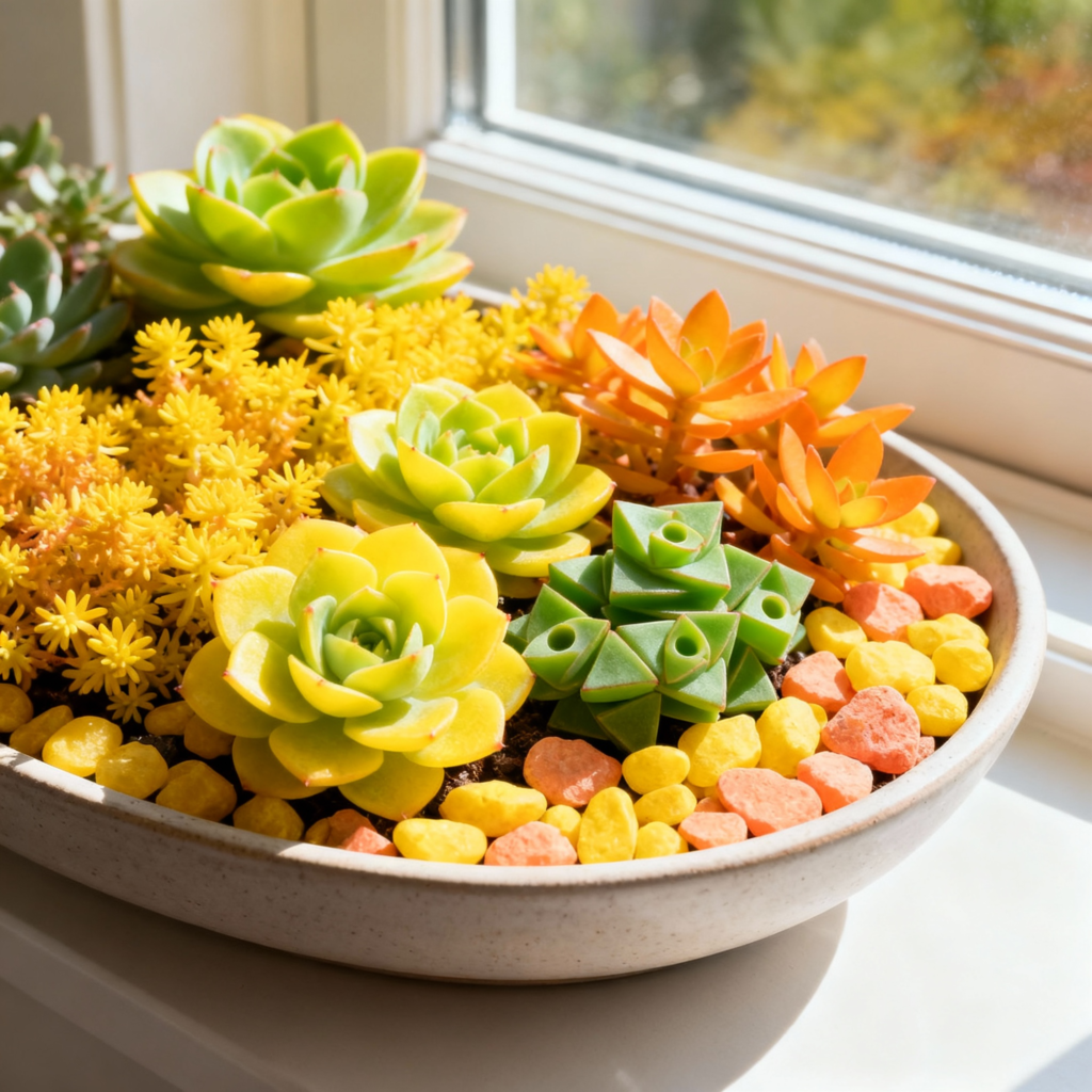 Pick plants that change with sun: Graptosedum ‘California Sunset’, Echeveria ‘Afterglow’, and Sedum nussbaumerianum. Place near bright light and watch the colors pop over weeks. Nature’s slow-burn glow up.