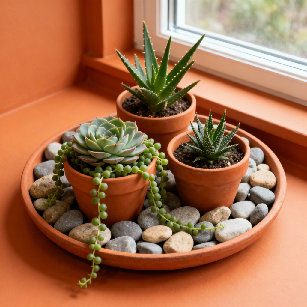 Group three terracotta pots inside a larger tray filled with pebbles. Plant each with a different texture—one rosette, one trailing, one upright. Looks curated, hides overwatering sins.