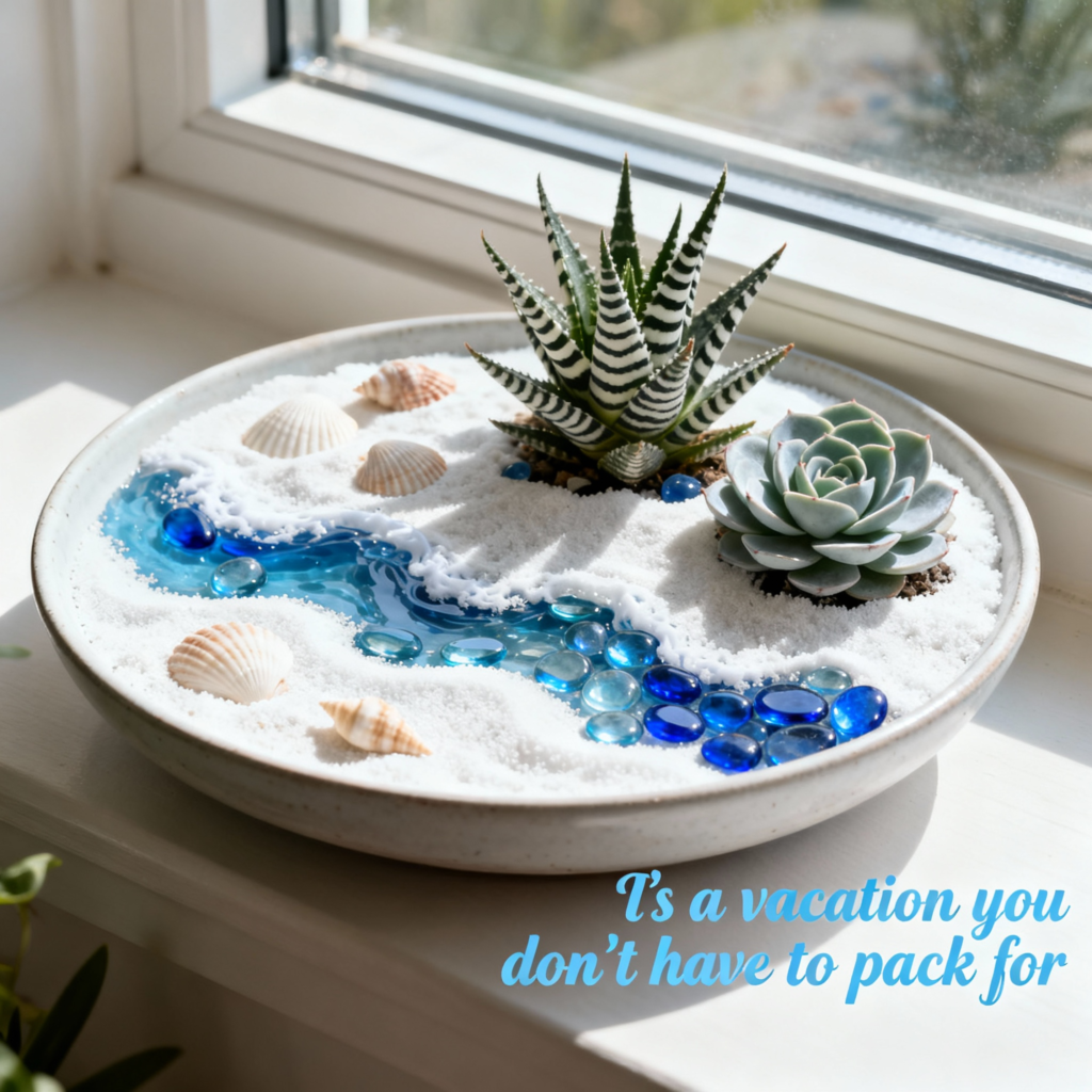 White sand top dressing, a few shells, and blue glass pebbles as “water.” Use Haworthia and Graptosedum to keep it tidy. It’s a vacation you don’t have to pack for.