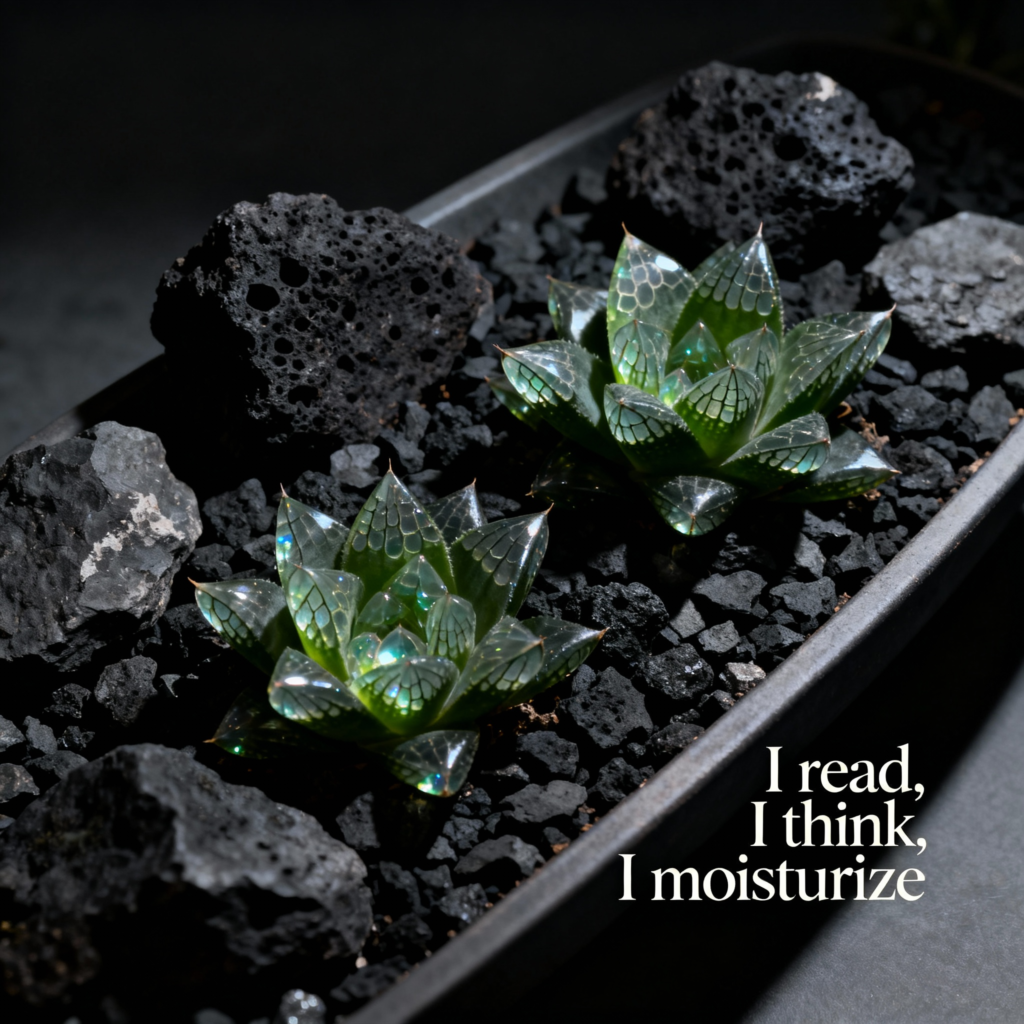 Dark basalt rocks + deep green plants like Haworthia cooperi. Add charcoal gravel for drama.