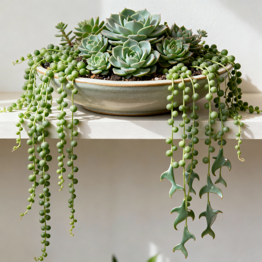 Dish with a gentle rim, planted with compact succulents in the center and String of Pearls or String of Dolphins draping over the edge. Hang it or let it spill from a shelf.
