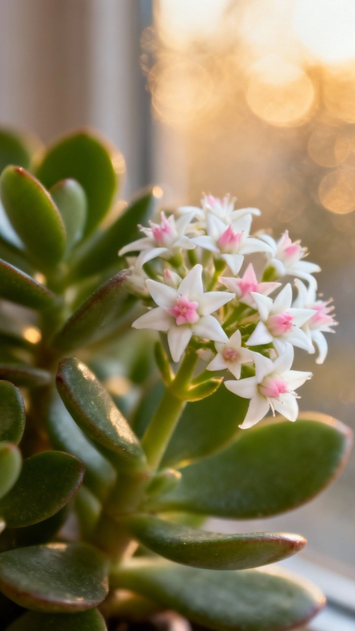 Jade can bloom with small, starry white or blush-pink flowers—usually in winter.