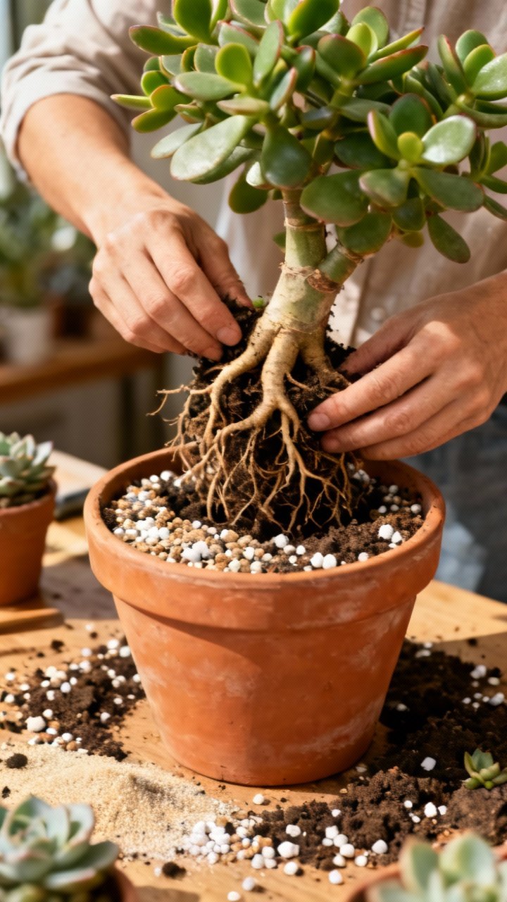 Jade wants fast-draining soil. Use a cactus/succulent mix or mix your own: two parts potting soil, one part perlite or pumice, one part coarse sand. Keep it airy and gritty. Pot choice matters.